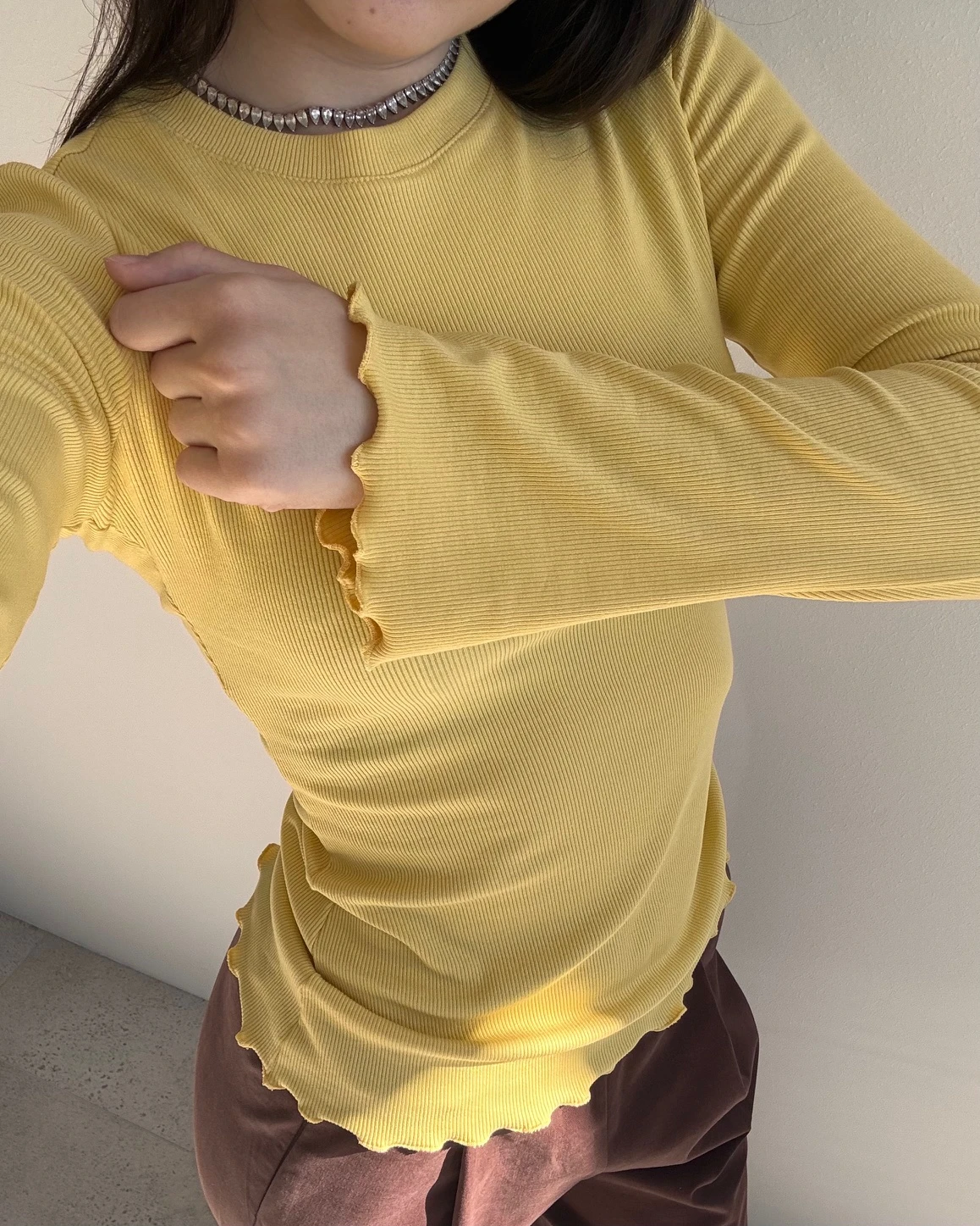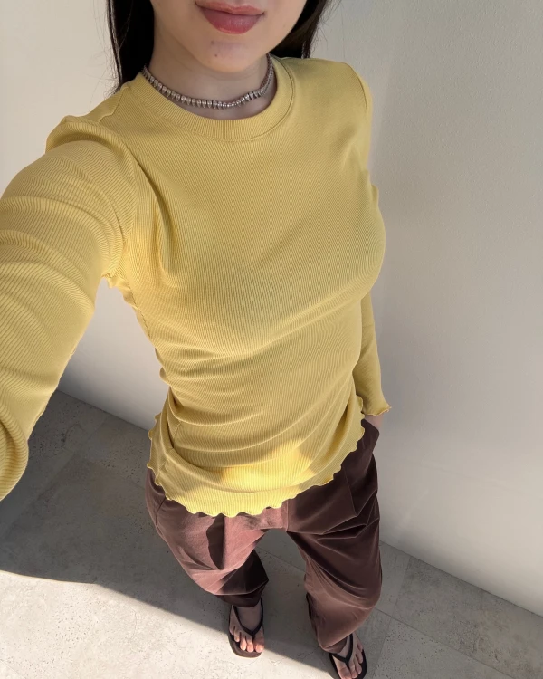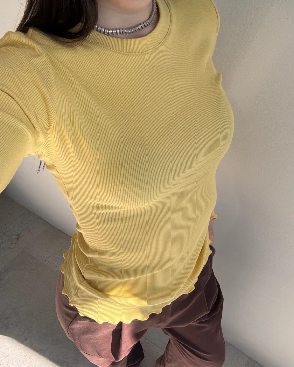 Dopasowany longsleeve w kolorze żółtym to wygodna i kobieca baza codziennych stylizacji. Uszyty z miękkiego, elastycznego i przyjemnego dla ciała materiału, dobrze dopasowuje się do sylwetki i komfortowo ją otula. Delikatne wykończenie w formie mereszki przy rękawach i na dole dodaje całości subtelności i lekko romantycznego charakteru.
