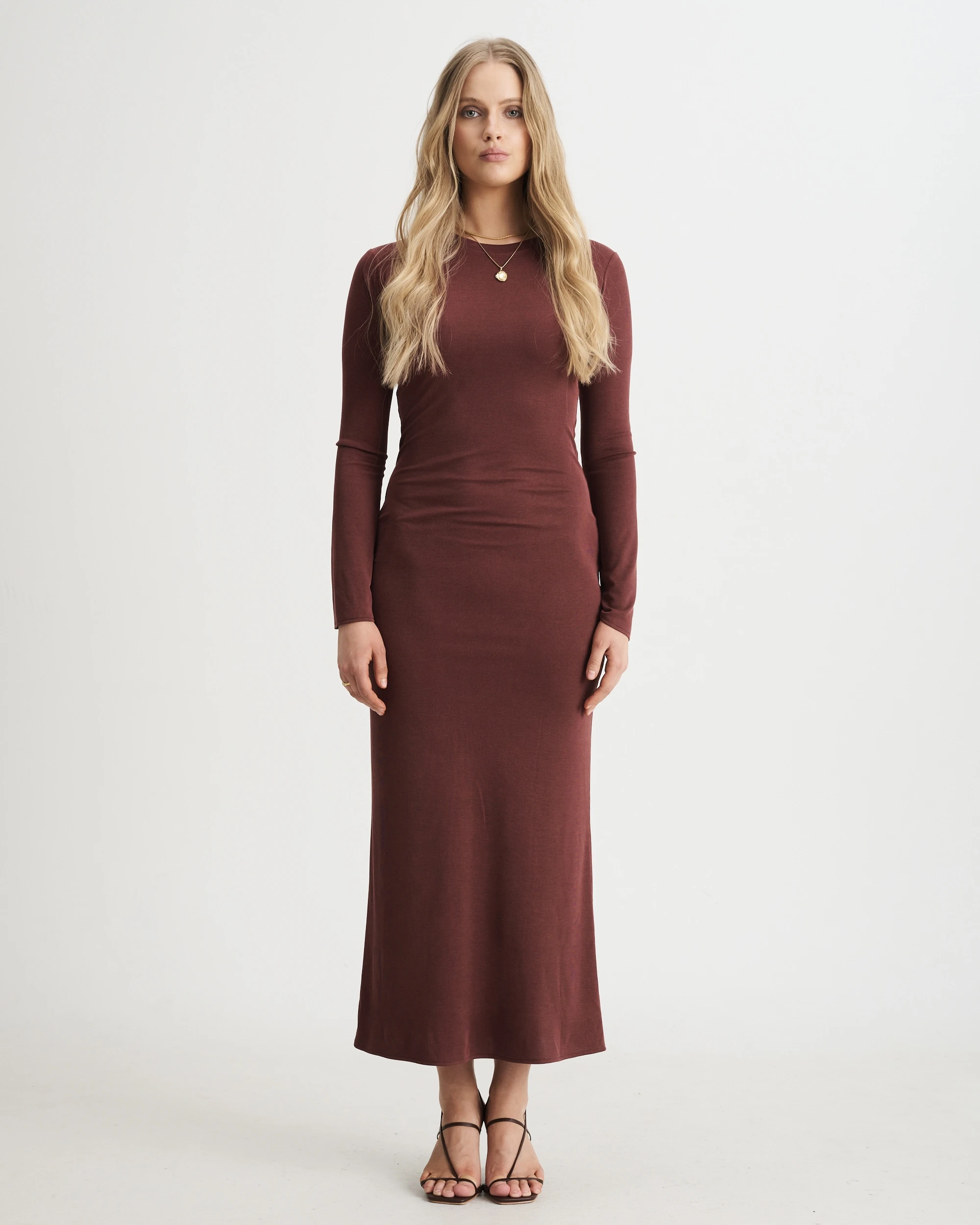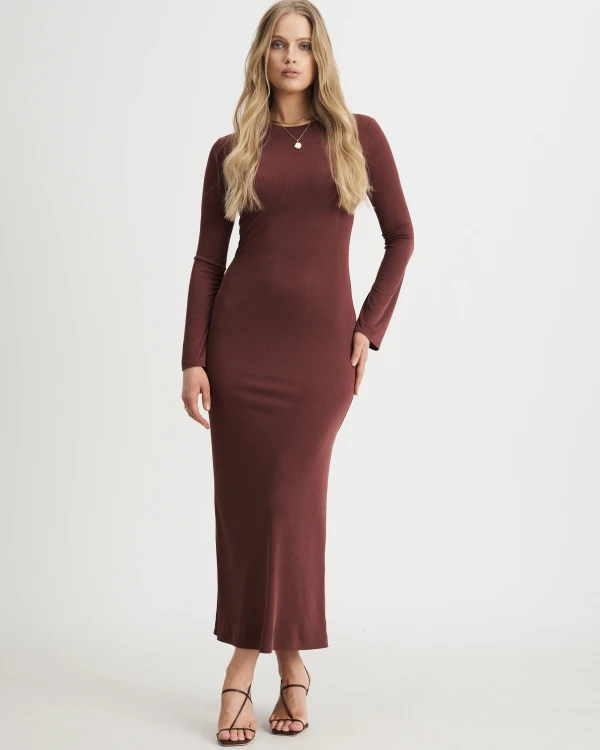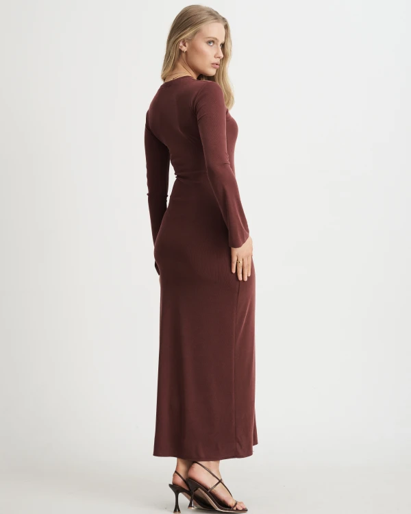 - brązowa długa sukienka damska,