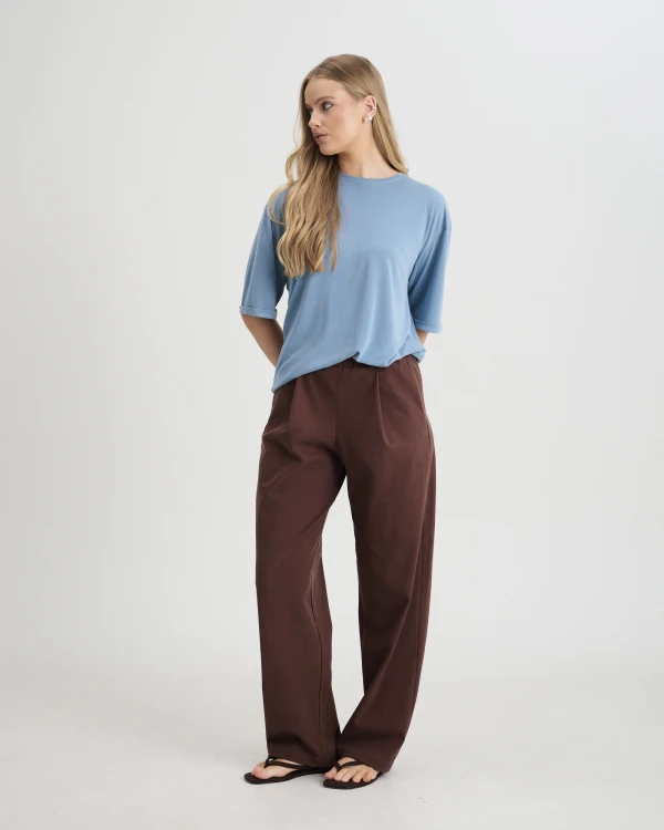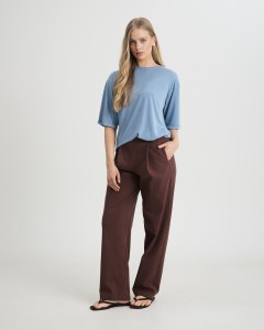 T-shirt Noa niebieksi to lekki, luźny t-shirt damski, który sprawdzi się jako wygodna baza codziennych stylizacji. Niebieski kolor nadaje mu świeżości, a swobodny fason i miękko układający się materiał zapewniają komfort noszenia i nowoczesny, niewymuszony charakter. Tkanina z dodatkiem LENZING™ Modal sprawia, że model jest przyjemny dla ciała, lekki i dobrze układa się na sylwetce.